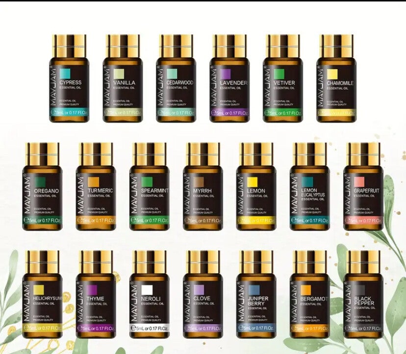 ✔ 20 huiles essentielles pures : Lavande, Bergamote, Menthe poivrée, Citron, Encens, Arbre à thé, Vanille, Myrrhe, et bien d’autres.